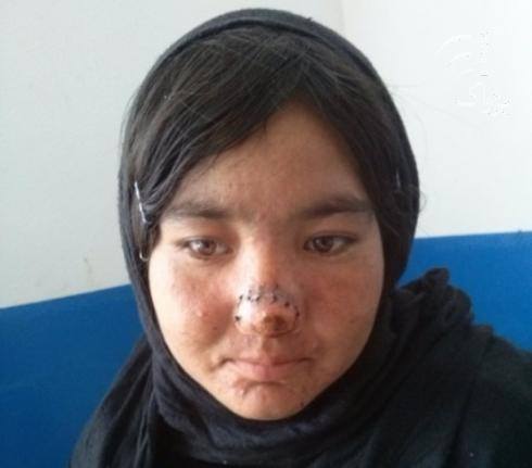 شوهر این زن پس از بریدن بینی خانمش فرار کرده و قرار است گل چمن برای درمان به کابل انتقال داده شود.